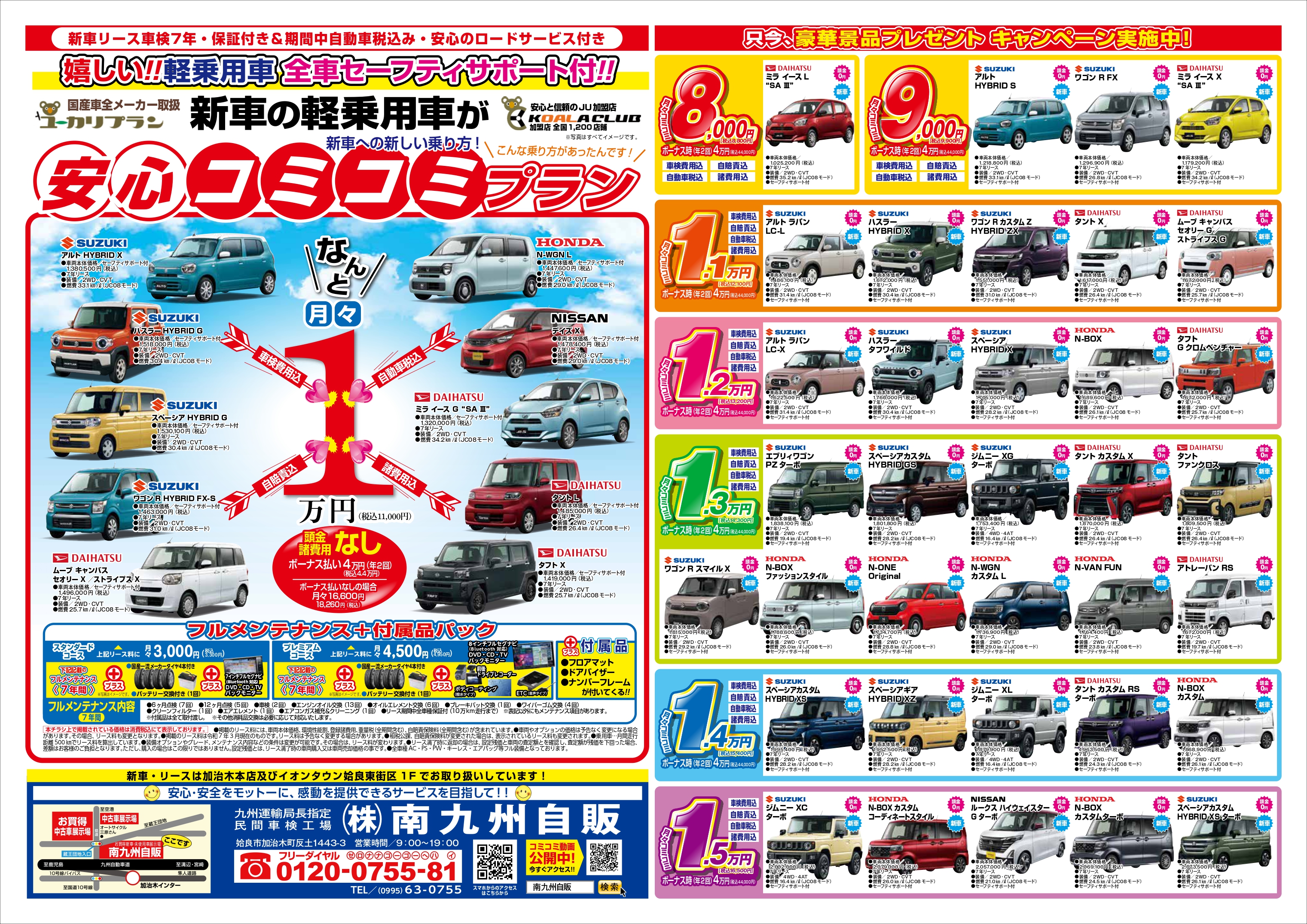 南九州自販のカーリースなら新車の軽自動車が車検・自動車税・自賠責・諸費用込でなんと月々1.1万円(税込)から!!